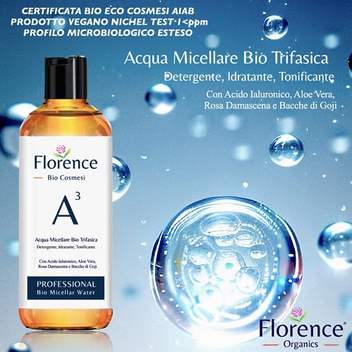 Florence A3 250 ml Bio Acqua di Rosa damascena Micellare Trifasica Struccante Detergente, Idratante e Tonificante Con Acido Ialuronico, Aloe Vera, Olio d'oliva, Estratto di Bacche Goji.