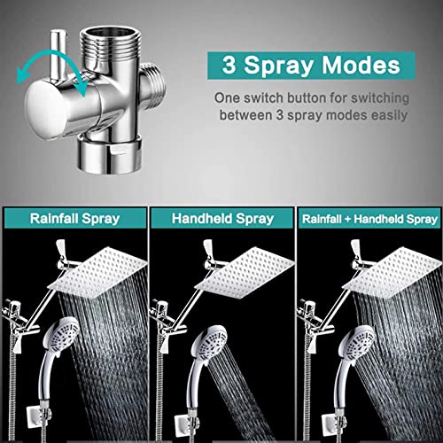 ❤ Shower Head Combo: 8'' Large square rainfall showerhead all-chrome finish 304# stainless steel for the highest rust resistance and longevity. Using ultra-thin design and advanced air booster technology to make the water pressuremore higher, offer superior rain spray shower experience even at low water flowand pressure. The 4.5'' face handheld shower uses chrome plated durable ABS material, more concise, generous and applicable