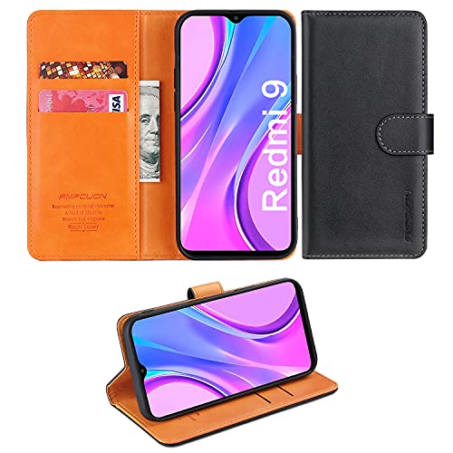 FMPCUON Cover Compatibile per Xiaomi Redmi 9 - Custodia in Flip Pelle PU a Libro Portafoglio Case - Premium Folio Wallet Protettiva Caso, Ultra Sottile Protezione Cover Bumper, Nero