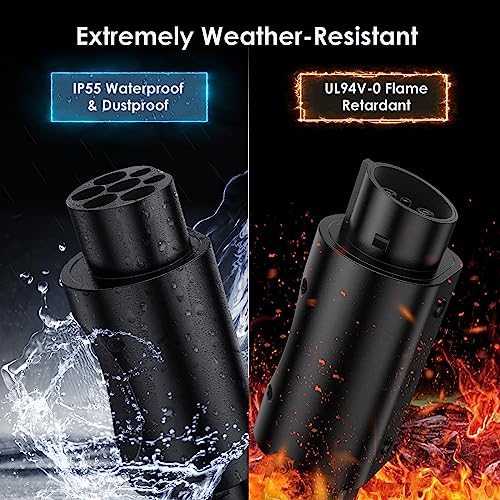 RESISTENTE ALLE INTEMPERIE - Con un grado di impermeabilità IP65 e una gamma di temperature di esercizio da -30 ℃ a 50 ℃, questo adattatore per cavo di ricarica EV tipo 2 a tipo 1 è progettato per resistere a tutte le condizioni atmosferiche, rendendolo una scelta affidabile per uso interno ed esterno.