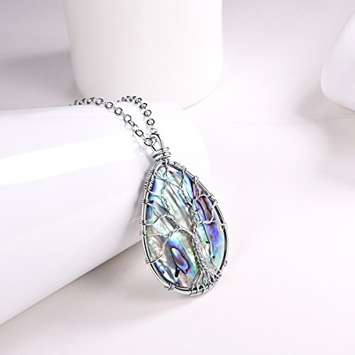FOCALOOK Collana Pendente Donna Ciondolo a Forma di Goccia con Albero della Vita Conchiglia Nuturale Colorata Catena Regolabile Gioiello di Fortuna Energia Regola Natale Compleanno Argento