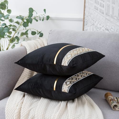 Set di 2 Fodere per Cuscino Modern Luxury 45x45 cm Federe Cuscini Velluto Nero con Cuciture in Pelle Dorata e Paillettes Quadrate Copricuscini per Divano per Soggiorno Interno o Esterno