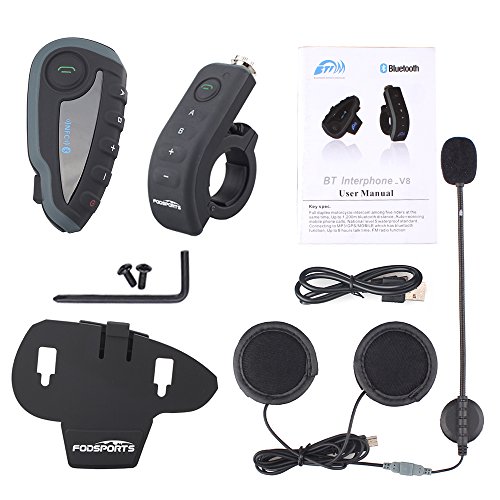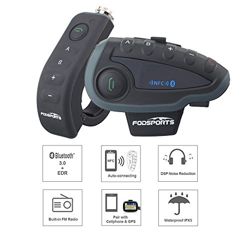 Fodsports Kit auricolari con interfono Bluetooth 3.0 per casco moto con vivavoce multi sport e telecomando sul manubrio, radio FM, NFC 1200 m, impermeabile, ideale per sci ed equitazione,fino a 5 motociclisti in full duplex.