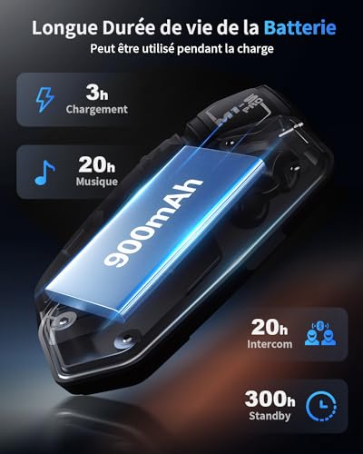 Potente batteria M1-S pro citofono Bluetooth casco moto a una batteria ricaricabile da 900 mAh, una batteria al litio appositamente progettata, sicura, di alta qualità, Bluetooth Sistema di comunicazione può supportare 16 ore di musica, 20 tempi di citofono e 300 ore di standby.
