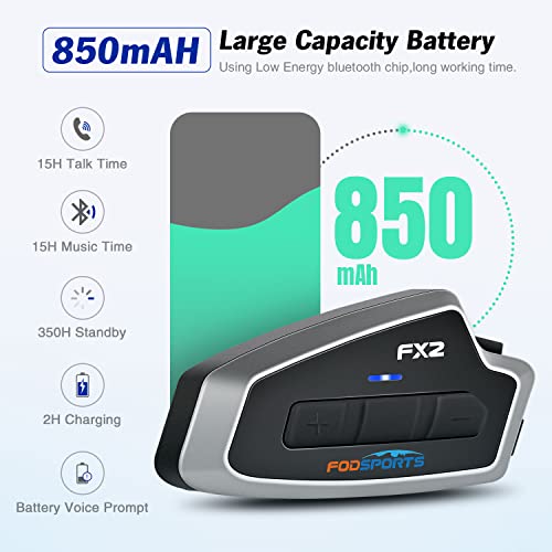 Fodsports FX2 Interfono Casco Moto,Bluetooth V5.0 Collegare 3 Piloti Comunicazione 2 Persone 1000Mt, Condivisione della Musica, Auricolare per Casco Moto Vivavoce voce GPS Navigazione, FM