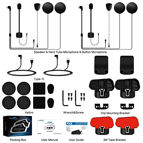 Accoppiamento universale/compatibile:Il Interfono da casco FX2 supporta la connessione a una varietà di dispositivi,Due tipi di microfoni e clip di montaggio, clip meccanica 3M/ clip in gomma/microfono a tubo flessibile e microfono a tubo rigido, si adattano alla maggior parte dei caschi da moto, adatti a caschi integrali, mezzi caschi o caschi da sci.