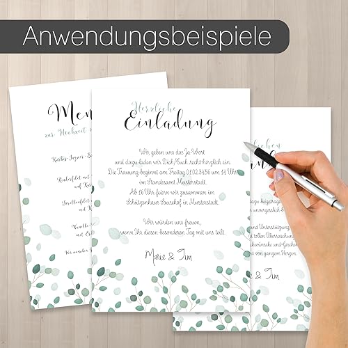 La carta da lettere ha una superficie bianca con applicazioni dettagliate in eucalipto. Ha inoltre un effetto molto naturale grazie alle diverse tonalità di verde.