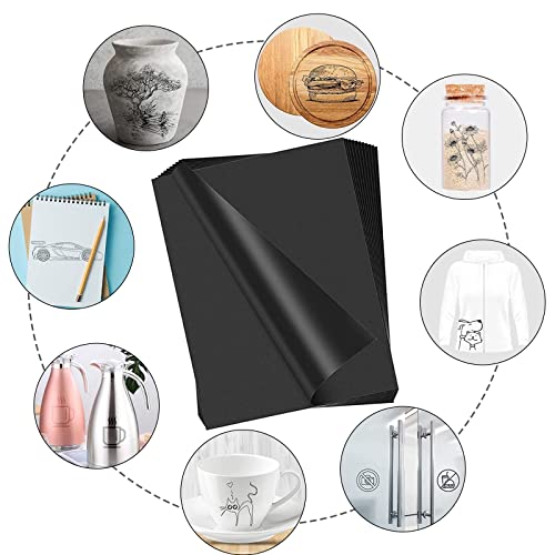 Lavora alla grande su molte superfici: La carta di grafite può essere usata per tracciare il disegno, il modello o le immagini su tela, carta, legno, vetro, metallo, ceramica, argilla ecc. Ma non è adatta per tessuti, tatuaggi e progetti di cucito