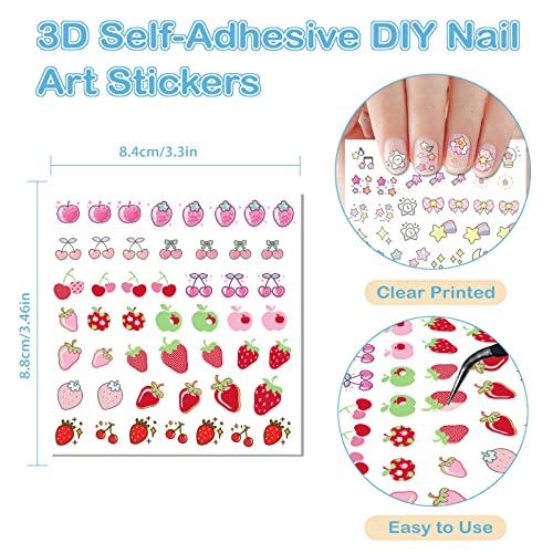 24 Fogli Graziosi Adesivi per Unghie per Bambini Ragazze e Donne Nail Art, Adesivi per Nail Art Coniglio Anatra Fiocco Torta Fiore Fragola Ciliegia Anguria Limone per Decorazione Nail Art con Pinzette