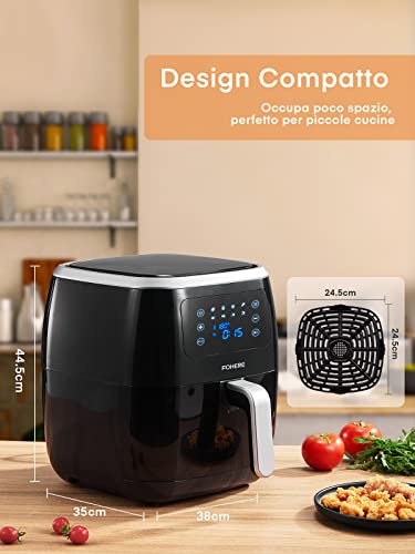 FOHERE Friggitrice ad Aria 6 L, 1800W Air Fryer con 8 Programmi, Tecnologia Rapid Air, Pannello Touch a LED, Cestello Removibile Anti Aderente, Senza BPA e PFOA per Patatine Fritte/Ali di Pollo/Pizza