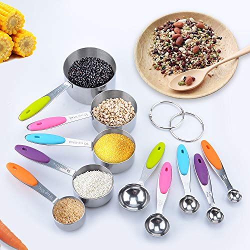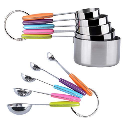 Fohil Set di 10 Misurini e Cucchiai, 5 Misurini di Tazze e 5 Misurini Cucchiai, Utensili da Cucina Resistente con Acciaio Inossidabile Manici in Silicone Antiscivolo per Cucina Cottura per Misurare
