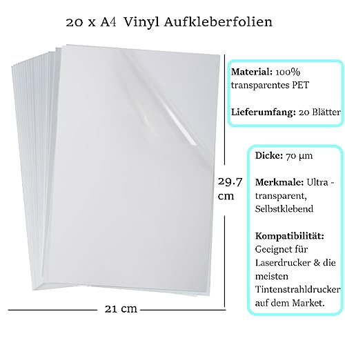 20 fogli di pellicola adesiva: il set di carta adesiva trasparente FOLANDO da stampare contiene 20 fogli di carta A4 con pellicole autoadesive. Adatto sia per stampanti laser che a getto d'inchiostro.