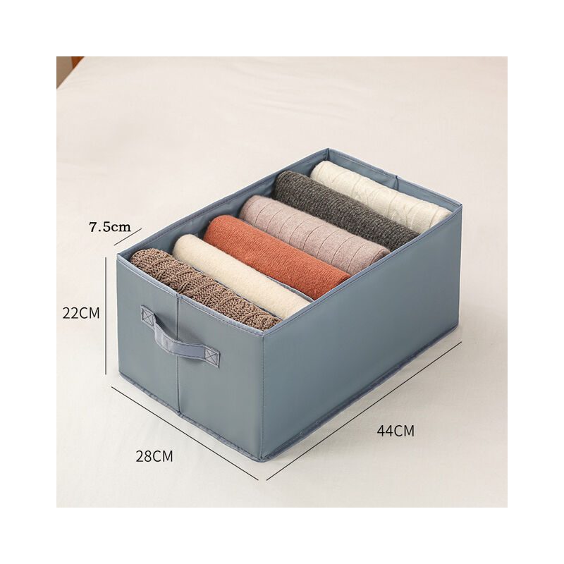 Foldable Jeans Storage Box Divider Boxes for Jeans Underwear Socks Bra Cabinet Organizer Storage Room Wardrobe Description Features: 100% brand new and high quality. Quantity: 1Pcs underwear,socks,pants,handkerchiefs,shirts, etc. Material: PP Color:Grey,Blue Size:6 grids:28*44*22cm 7 grids:25*36*20cm 9 grids:25*36*20cn Package List: 1 * Storage box Note: Due to the light and screen setting difference, the item's color may be slightly different from the pictures. Please allow slight dimension difference due to different manual measurement.