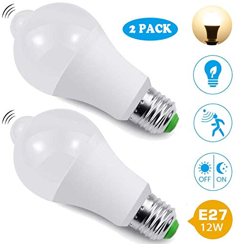 FOLGEMIR 2 PACK lampada LED con rilevatore di movimento, sensore PIR, 230 V, 12 W, E27, 3000 K - bianco caldo, 1020 lumen, perfetto per le scale, garage, sala, cortile, corridoio, terrazzo