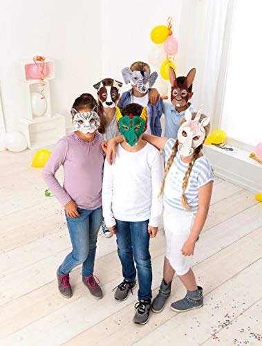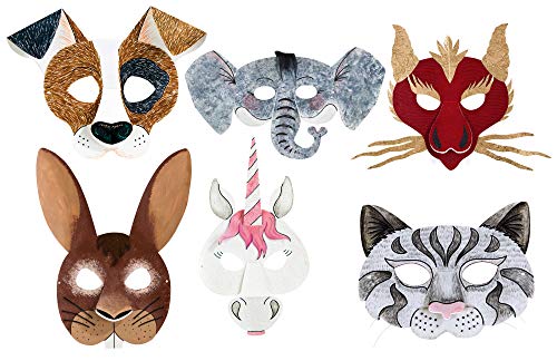 Contenuto della confezione: 6 maschere animali (1 coniglio, elefante, drago, cavallo/unicorno, gatto e cane)
