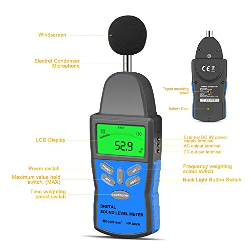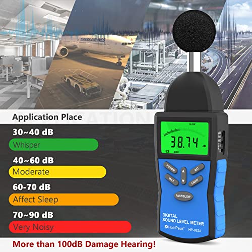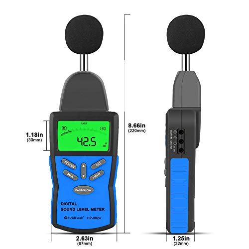 Fonometro Digitale, HoldPeak 30~130 dBA/dBC Misuratore di Livello Sonoro con Retroilluminazione LCD HP-882A, Hold Massimo,Regolazione Della Sensibilità e Interruttore dBA/C,Batteria 9V