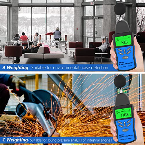 ★【Fonometro ad Alta Precisione】Intervallo di misurazione: 30 ~ 130dBA / 30 ~ 130dBC. Precisione: ± 1,5 dB. Risoluzione: 0,1 dB. Gamma di frequenza: 31,5HZ-8.5KHZ. Frequenza di campionamento: 2 volte / sec. Con retroilluminazione LCD, indicatore di batteria scarica, indicazione di sovraccarico, regolazione dinamica delle funzioni.