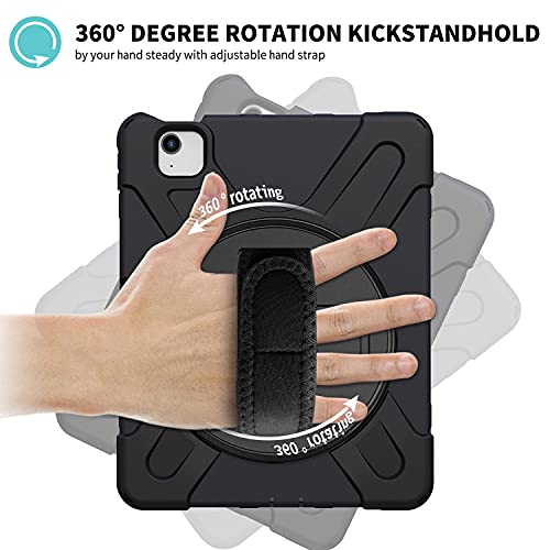 Fonrest Robusto Cavalletto Custodia per iPad-Air-5 2022/per iPad-Pro-11'' con portamatite, per iPad-Air-4 Cover antiurto ibrida con anello di impugnatura girevole a 360°, tracolla (Nero)