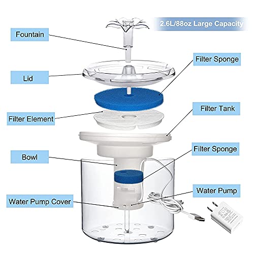 【Triplo sistema di filtrazione】: il distributore di acqua per animali da compagnia è dotato di 2 filtri, ciascuno composto da uno strato di cotone, carbone attivo di noce di cocco e resina scambiabile di ioni Formulano un triplo sistema di filtrazione per evitare che gli animali cadano malati. La fontana per animali da compagnia aggiunge una spugna di prefiltro intorno alla pompa per filtrare meglio le impurità e prolungare la durata della pompa.