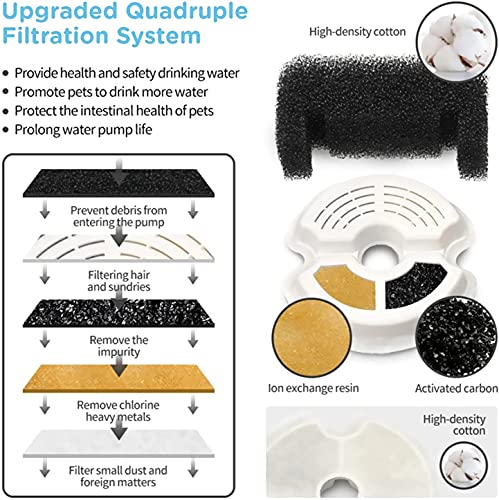 【Grande capacità facile da smontare e pulire】Distributore d'acqua per animali domestici ha una capacità d'acqua di 2L / 70 once,Può contenere abbastanza acqua per animali di piccola e media taglia da bere per diversi giorni. Non è necessario preoccuparsi dell'acqua potabile degli animali domestici quando si viaggia per lavoro e in viaggio. L'elemento filtrante della fontana per animali do
