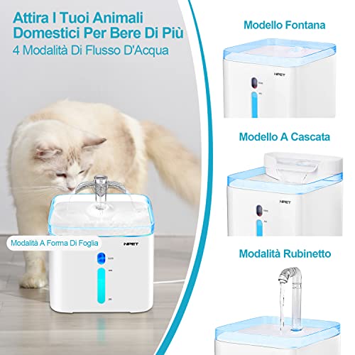 【4 impostazioni di flusso dell'acqua】modalità cascata: ampia cascata, aumenta il tenore di ossigeno dell'acqua. Modalità fontana: modalità di sovratensione dell'acqua di fonte fresca. È la modalità fontana più silenziosa. Modalità a forma di foglia e modalità rubinetto: questo modo unico di far scorrere l'acqua può incoraggiare gli animali domestici a bere più acqua. Ogni modalità risponde alle esigenze di vari animali da compagnia.