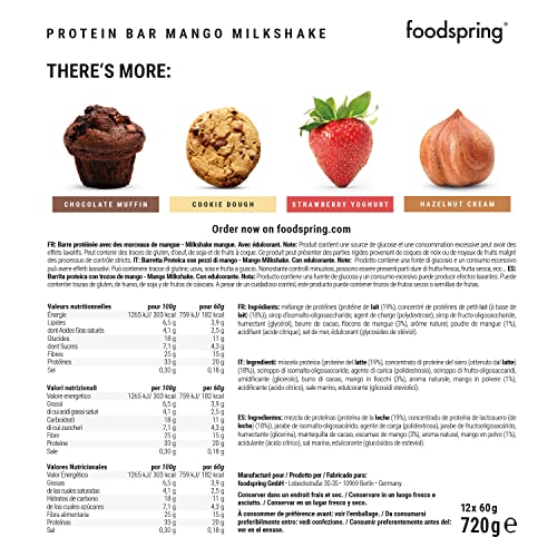 Foodspring Barrette proteiche, Mango Milkshake, 12 x 60g, 33% di proteine, A ridotto contenuto di zuccheri, Perfette dopo l'allenamento o come snack da viaggio