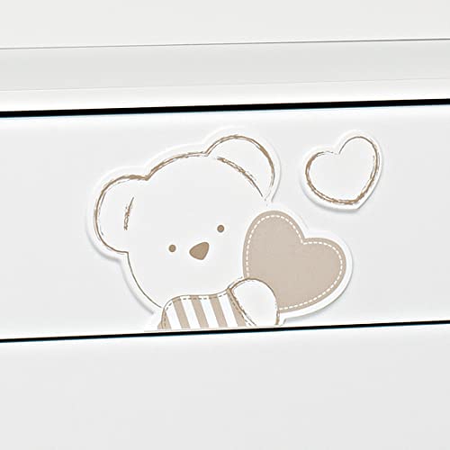 La cassettiera in legno Dolcecuore di Foppapedretti ha quattro ampi cassetti, il primo è decorato con il tenero motivo di cuori e orsetto che caratterizza tutta la collezione