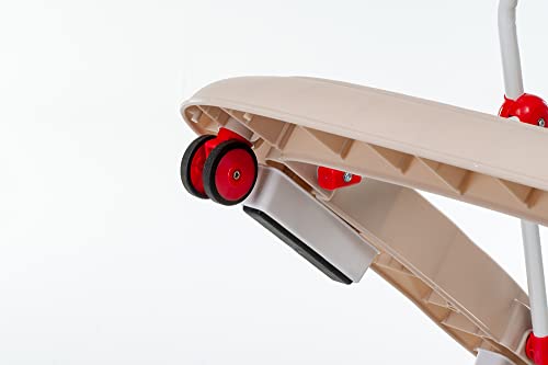 Dotata di quattro ruote di cui due piroettanti e due fisse gommate. La base è predisposta con dispositivo antiscivolo per garantire il blocco del girello in prossimità di scale o gradini.
