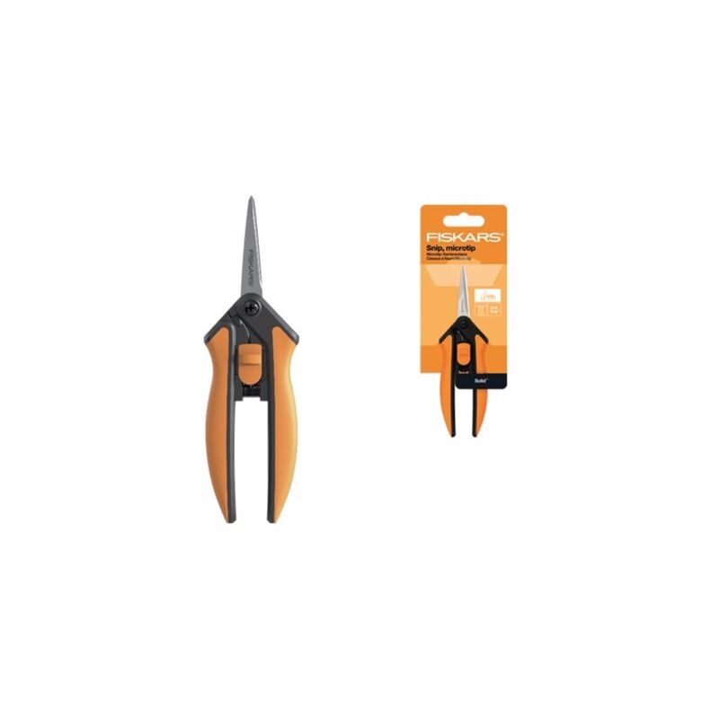 Forbici Solid Snip SP13 Fiskars Le lame di precisione Micro-Tip garantiscono la massima capacità di taglio fino alla punta, la molla apre delicatamente le lame dopo ogni taglio per ridurre l'affaticamento della mano, manici SoftGrip. Ideali per rifilatura e potatura di piante e fiori. Lunghezza 14 cm.