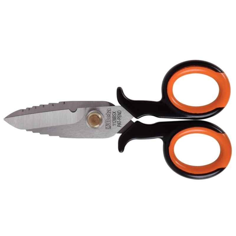 FORBICI PER ELETTRICISTA BETA INOX 128BSX - LUNGHEZZA TOT. MM.145 Forbici per elettricisti con profili a fresa graduata in acciaio inossidabile. Studiate per allargare fori su scatole di derivazione in plastica e chiudere tubi corrugati, custodia snodata agganciabile alla cintura, impugnatura bimateriale, perno antiallentamento. Lunghezza totale mm. 145