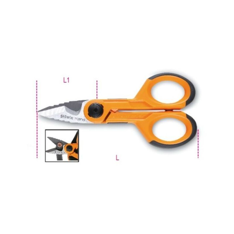 Forbici per elettricisti con svasatore lame in acciaio inossidabile con microdentatura, gola tranciacavo e crimpatore per puntalini - Beta 1128FXS • Custodia agganciabile alla cintura • Impugnatura bimateriale • Perno anti-allentamento • profilo e fresa: studiate per allargare fori su plastica da 13 a 21 mm. g Cod. Art. L mm L1 mm A mm B mm mm² Peso g 011280095 1128FXS 145 52 22 16 50 80