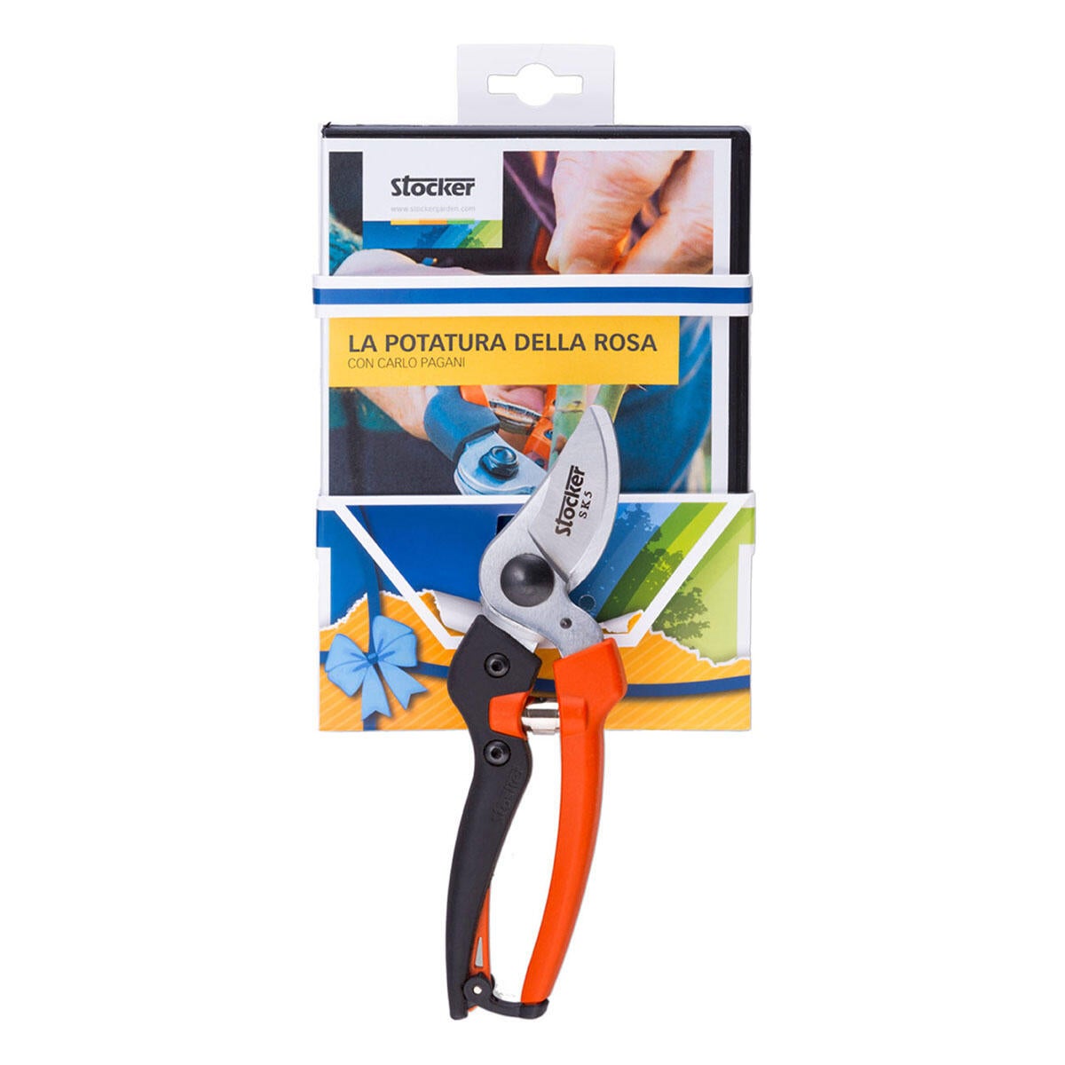 DVD e forbice marca Stocker con lama in acciaio e manico in acciaio e plastica. Taglio passante.