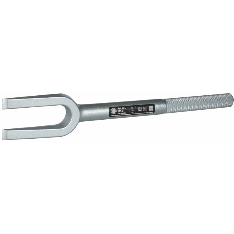 DescrizioneEsecuzione:Testa robusta cuneiforme della forcella con asta di supporto resistente e impugnatura zigrinata.Uso:Per allentare snodi sferici del tirante trasversale, ammortizzatori, leve di comando sterzo, ecc. Infilare la testa della forcella − battendo sullo stelo i pezzi vengono separati.Dati tenici Per perni sferici di ⌀ 27 mm - 40 mm Apertura forcella 29 mm Tipo di prodotto Forcella di separazione Codice articolo 881700 3 EAN / GTIN 4021176025013 Codice del produttore 135-3