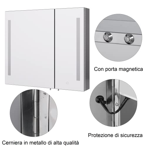 FOREHILL Armadietto Pensile da Bagno Con illuminazione LED e Interruttore Touch,Armadietto da Bagno con Specchio,Mobile Bagno Specchiera da Parete Muro con Ante Acciaio Inossidabile 76x13x67cm Bianco