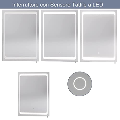 【Armadietto a Specchio con illuminazione a LED】: la luminosità delle luci a LED è regolabile. Premere brevemente l'interruttore del sensore tattile, la luce è la più luminosa in questo momento. Se si preme nuovamente brevemente il pulsante di controllo, la luce si attenuerà leggermente;