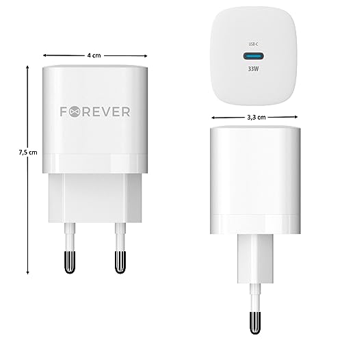 Caricabatterie Rapido GaN in formato ultra compatto dotato di una porta USB-C e di una potenza di 33W perfettamente adatta alla ricarica rapida degli ultimi dispositivi sul mercato. Forever è un marchio dell'Unione Europea.