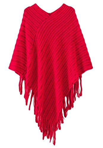 FOREVER YUNG Women's Solid Color Tippet Sweater with Tassels on the Hem Red