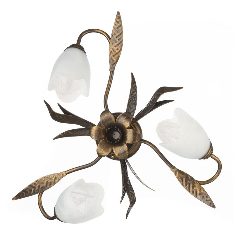Descrizione La plafoniera Forgiata è perfetta per interni dallo stile classico, rustico e tradizionale. La struttura è in metallo color marrone spennellato oro, lavorato a mano in Italia, mentre i paralumi, a forma di calla, sono in vetro opaco con decoro alabastro bianco e bordi smerlati. Ideale per il corridoio, la camera da letto, la sala, il soggiorno o la cucina. Contenuto della confezione 1 x struttura plafoniera Sonia 3 luci, 3 x vetri