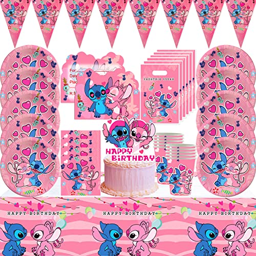 Forhome 63 Pezzi Decorazioni Compleanno Lilo e Stitch, Compreso Piatti, Tazze, Banner Triangolare, Grande Torta, Accessori per Feste Ragazzi,10 Ospiti (Rosa)