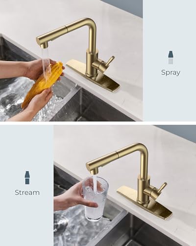 Abbiamo a cuore la tua esperienza: regola la pressione e la temperatura dell'acqua con il rubinetto da cucina monocomando integrato, con 2 modalità di impostazione (STREAM / SPRAY). Saldamente trattamento con nichel oro, resiste alle impronte digitali e alla corrosione, tubo resistente alle alte temperature. Portata: 1,8 galloni al minuto.