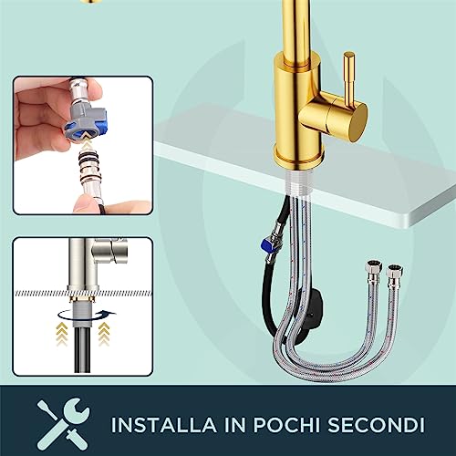 [Design flessibile a scomparsa] Il tubo flessibile facile da retrarre con adattatore girevole offre una gamma estesa di movimento con la possibilità di flettersi, ruotare e raggiungere tutto intorno al lavello, oltre alla comodità di una testina di spruzzo che si ritrae completamente e saldamente in posizione.