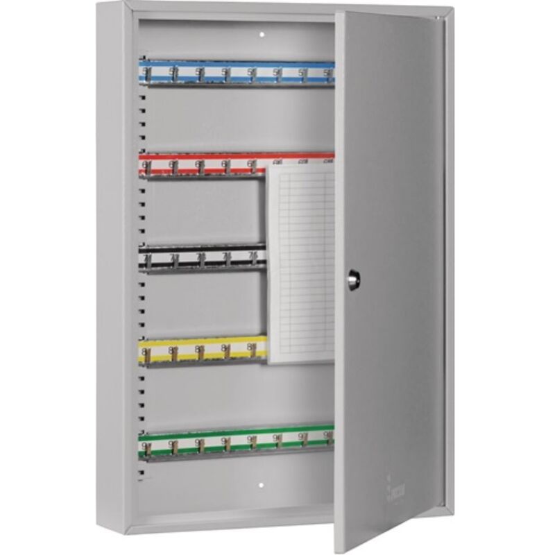 In versione stabile per fissaggio a parete · in lamiera di acciaio · grigio chiaro RAL 7035 · Serratura cilindro, 2 tasti · registro chiavi girevole · Strisce di gancio gradualmente regolabili (non preassemblate), di colore diverso, numerate consecutivamente · da 150 ganci dotati di una o due piastre intermedie 1 porta: da 150 ganci dotati di una o due pareti intermedie a 2 porte: da 500 ganci dotati di quattro pareti intermedie Consegna senza telecomando Altre caratteristiche tecniche: · Larghezza: 730mm · Profondità: 80mm · Altezza: 550mm · Modello: SZ
