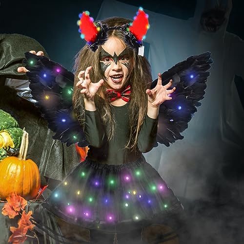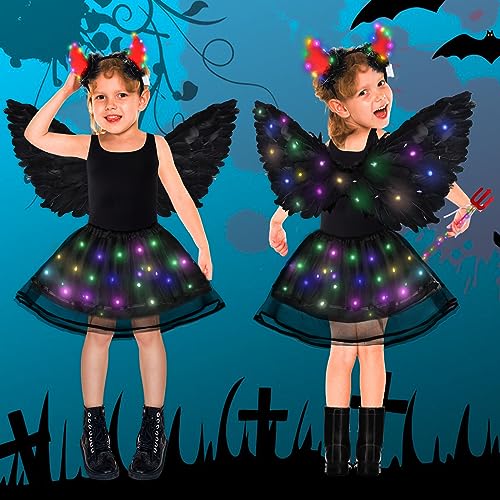 ♀️【Costume da Angelo per Bambini】Costume da angelo nero include 1 ala da angelo nera, 1 ornamento per capelli nero, 1 bacchetta da angelo e 1 gonna tutù nera. Questo costume da angelo è dotato di luci LED e tutti gli accessori emettono una luce scintillante per renderti l'angelo più bello.