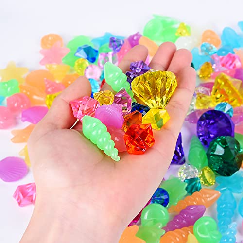 ✨【Set di Giocattoli per Immersione】166 pezzi. Include 1 scrigno del tesoro, 10 gemme grandi, 15 gemme medie, 40 gemme piccole, 100 conchiglie fosforescenti, stelle marine, conchiglie e altro. Queste gemme sono colorate e colorate in modo casuale.