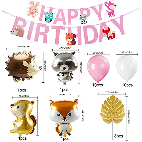 Forniture per feste a tema nella giungla: Ci sono lettere di livello safari 13 per banner HAPPY BIRTHDAY, 4 palloncini foil animali (volpe, procione, scoiattolo, riccio), 20 palloncini in lattice, 20 biglietti d'invito con buste, 52 x stoviglie, 6 x foglie di palma, 16 x decorazioni per torte.