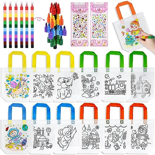【Set di Borse di Tela Fai da Te】Comprende 12 borse in tessuto non tessuto a doppia faccia con motivi, 6 pastelli colorati e 2 fogli di bellissimi adesivi a forma di diamante. I sacchetti di stoffa con disegni sono progettati per soddisfare l'interesse dei bambini per lo scarabocchio.