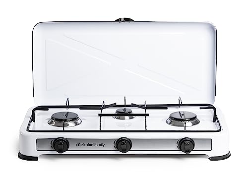 Fornello da Campeggio Melchioni Family, 3 Fuochi Portatile, Regolazione della Fiamma, Utilizzo Esterno, Design Compatto e Pulizia Semplice, 5.66 KW