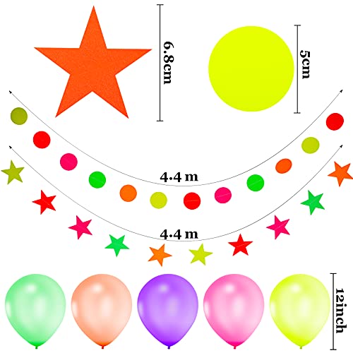 102 Forniture per Feste al Neon Palloncini Fluorescenti Bagliore Striscione di Ghirlande di Carta al Neon con Punti Cerchi di Luce Nera e Stelle per Decorazioni Compleanno Luminose