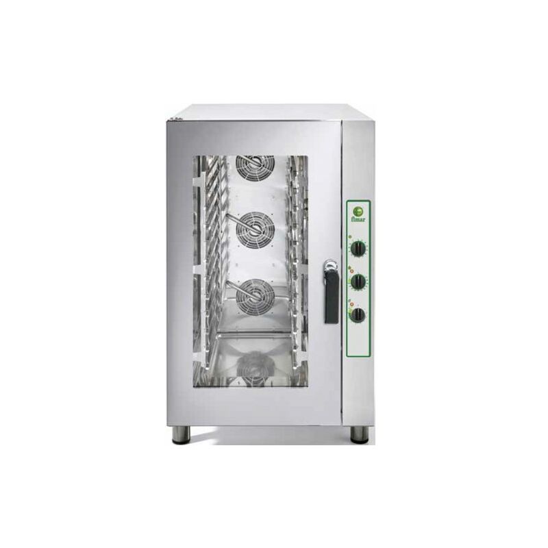 Codice RS8583 - Forno a convezione elettrico modello FI-STR10, dimensioni cm. 79x94.5x126 (lxpxh), capacità camera cottura 10xGN1/1 (interasse 80 mm), dimensioni camera cottura cm. 46.5x64x95 (lxpxh), 400 volt, 16.1 kw, temperatura di lavoro 50-300 °C. Timer meccanico 0-120 min. Struttura in acciaio inox. Illuminazione interna alogena. Porta con doppio vetro. Ventilatore centrifugo con autoreverse. Elettromeccanico. Umidificatore manuale (iniezione diretta).
