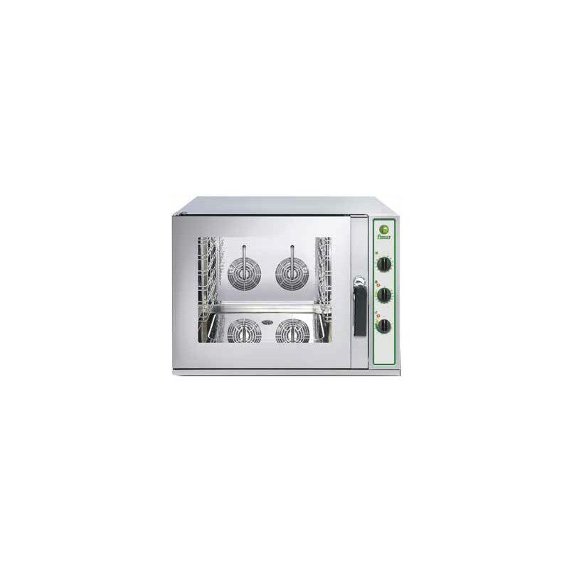 Codice RS8585 - Forno a convezione elettrico modello FI-TOP4M, dimensioni cm. 92x84x70.5 (lxpxh), capacità camera cottura 4xGN1/1 (interasse 80 mm), dimensioni camera cottura cm. 66x48x45.5 (lxpxh), 230 volt o 400 volt (specificare in fase d'ordine), 10.8 kw, temperatura di lavoro 50-285 °C. Timer meccanico 0-120 min. Struttura in acciaio inox. Illuminazione interna alogena. Porta con doppio vetro (vetro interno apribile). Ventilatore centrifugo con autoreverse. Elettromeccanico. Umidificatore con regolatore (iniezione diretta). Disponibile anche nella versione digitale (quantificazione a richiesta).